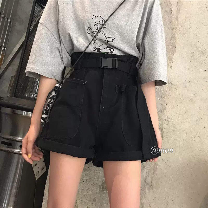 200753 Quần short bò nữ ulzzang cạp cao màu đen trơn tặng kèm đai có size - Đen - S,M