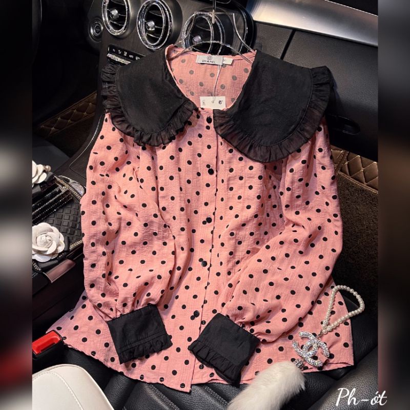 Áo sơmi chấm bi nhăn pha cổ đen bèo hàng QCL1