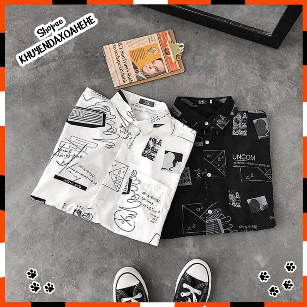 Giới thiệu A012 Áo sơ mi nam nữ 2 màu đen trắng họa tiết toán học tay lỡ dáng rộng, áo khoác ngoài form to có túi cộc tay trẻ trung