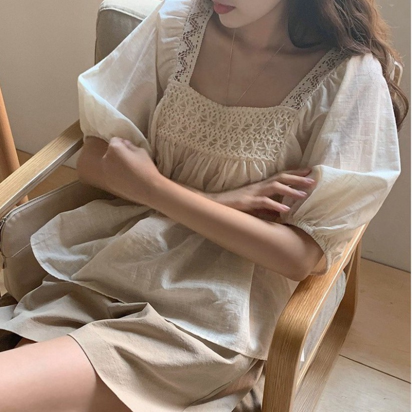 Giới thiệu [AMANDA]Set bộ áo cộc tay cổ vest cúc gỗ quần đùi đũi. Set bộ nữ áo quần cổ vest quần đùi cộc