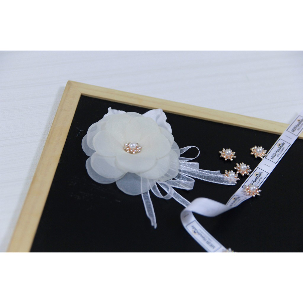Giới thiệu (Ảnh thật 100%) Hoa cài áo handmade mẫu vải voan nhụy đá mix lá gấm và ruy băng voan siêu xinh (No box)