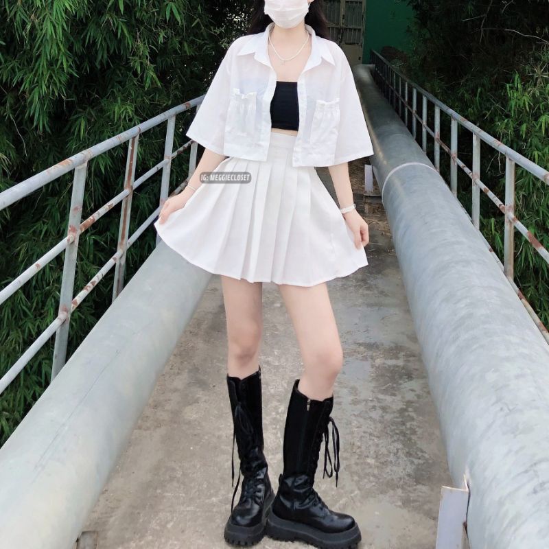 ✔️ Form dáng và chi tiết: Áo croptop sơ mi dáng rộng, có dây rút sau lưng - mặc lên đứng form, 2 túi thật với cách điệu nhún bèo hình bánh bao siêu cute.