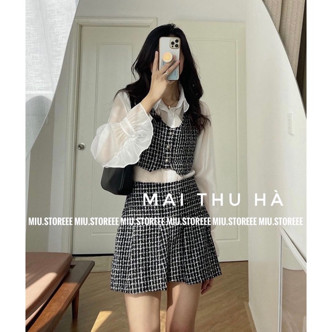 Thời Trang Nữ > Áo > Khác || [ẢNH THẬT] SET 3 MÓN DẠ TWEED ÁO SƠ MI VOAN PHỐI BÈO + GILE KẺ CARO KÈM CHÂN VÁY A
