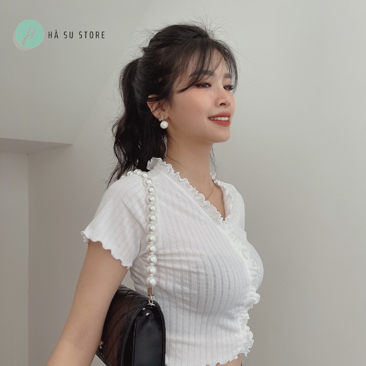 Thời Trang Nữ > Áo > Áo thun || (Ảnh+ Video Thật) Áo Crotop Nữ Kiểu Thun Gân Cổ Bèo, Thiết kế kẻ trung, Năng động, Cá tính