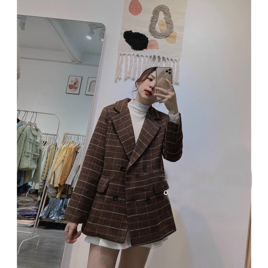 Áo blazer 2 lớp kẻ sọc nâu phong cách Hàn Quốc