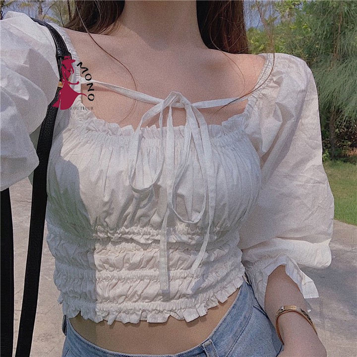 Giới thiệu Áo Croptop Cổ Vuông Nhún Bèo/ Áo Kiểu Tay Dài Cổ Vuông Trễ Vai Thanh Lịch Cho Nữ - Mono Boutique