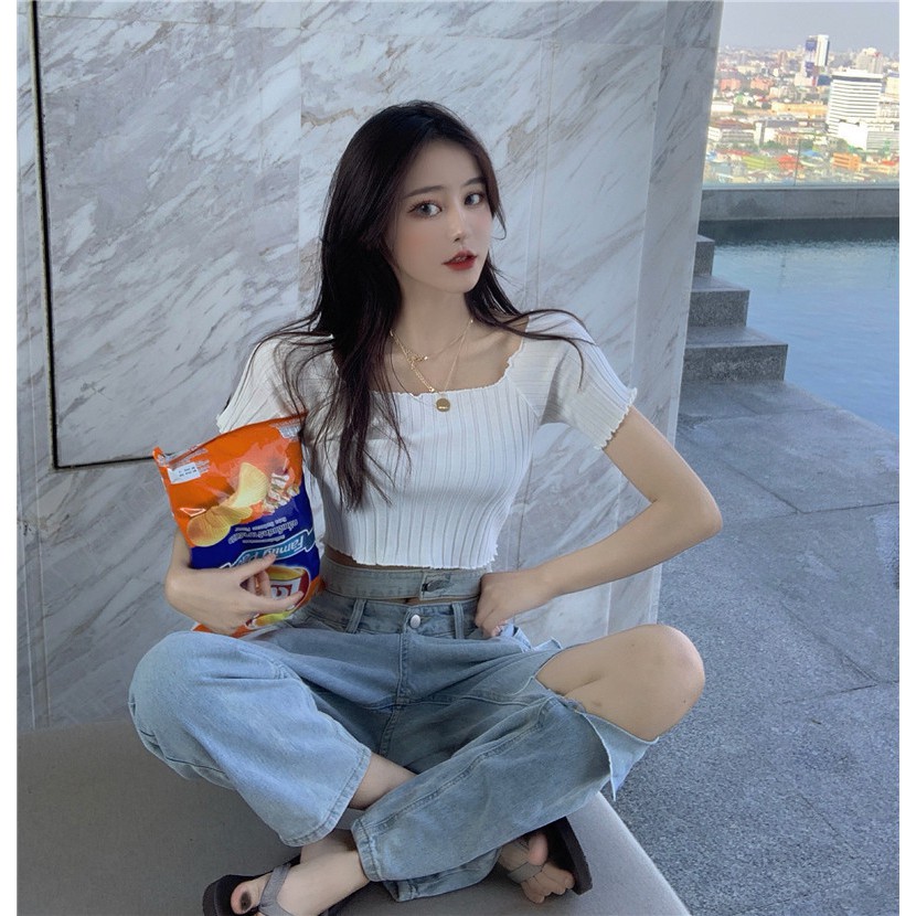 Giới thiệu Áo croptop cổ vuông viền gợn sóng dệt kim gân đũa-ACN12