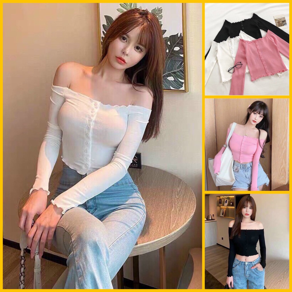 Áo Croptop Kiểu Nữ Trễ Vai Tay Dài Phối Nút Chất Thun Lụa Mịn Đẹp 🎀By bear.story