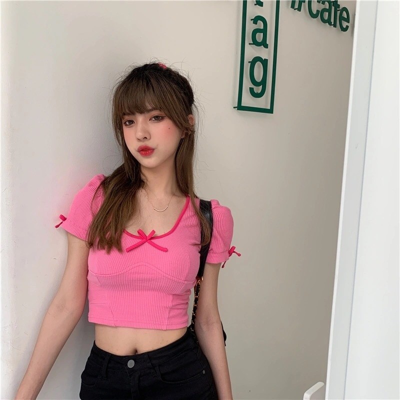 Thời Trang Nữ > Áo > Áo sơ mi || áo croptop thắt nơ hồng dễ thương chất liệu len dệt kim