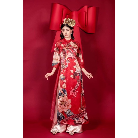 áo dài cách tân 4 tà tơ sen đỏ kết đính áo dài sen thiết kế tặng kèm gương mini cho đơn trên 250k