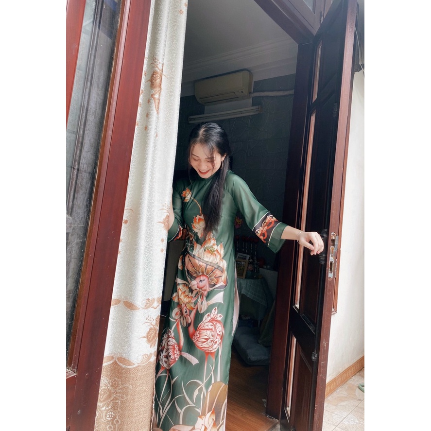 Áo Dài Cách Tân Nữ Thiết Kế Tơ Sen Mềm Mịn Màu Rêu