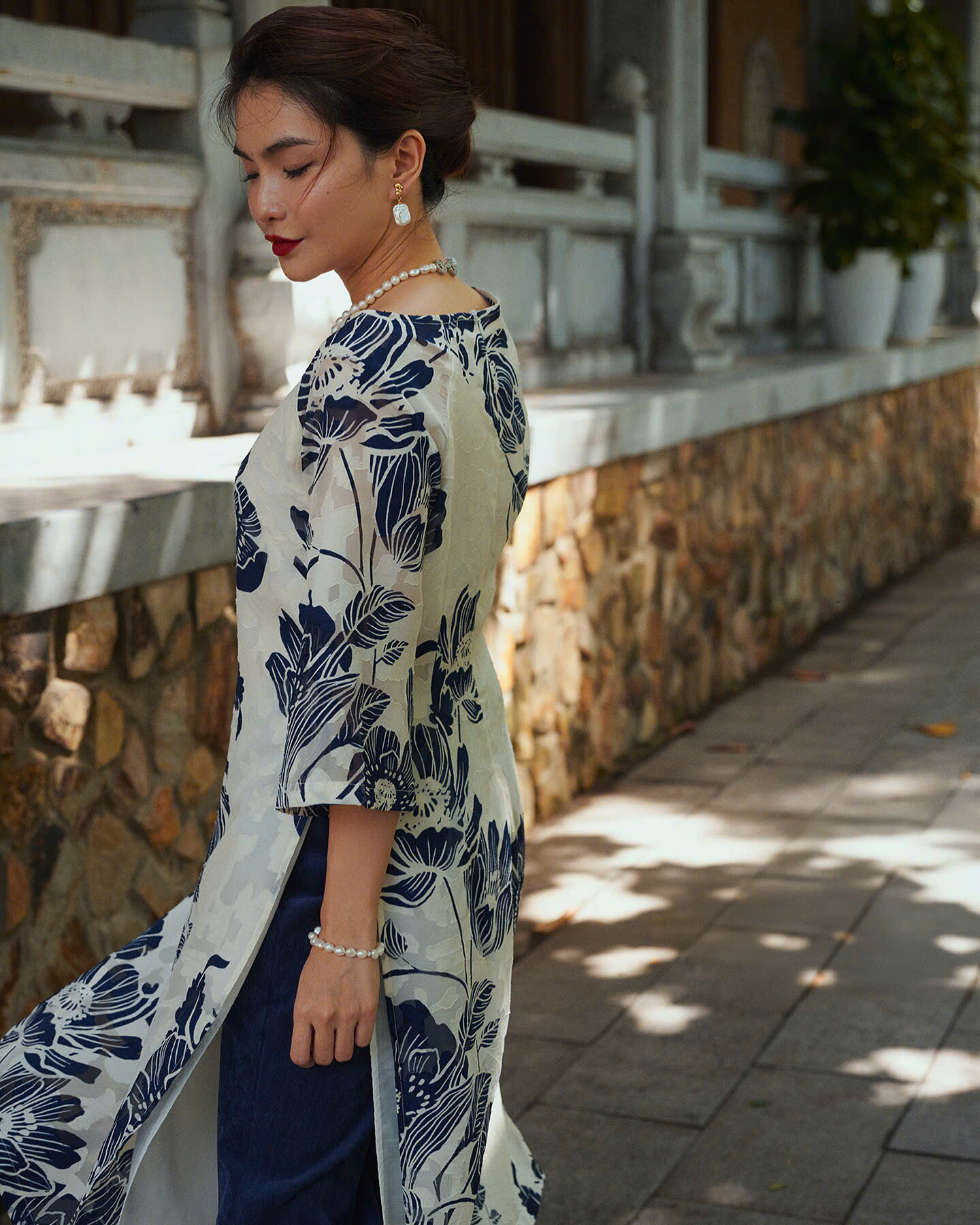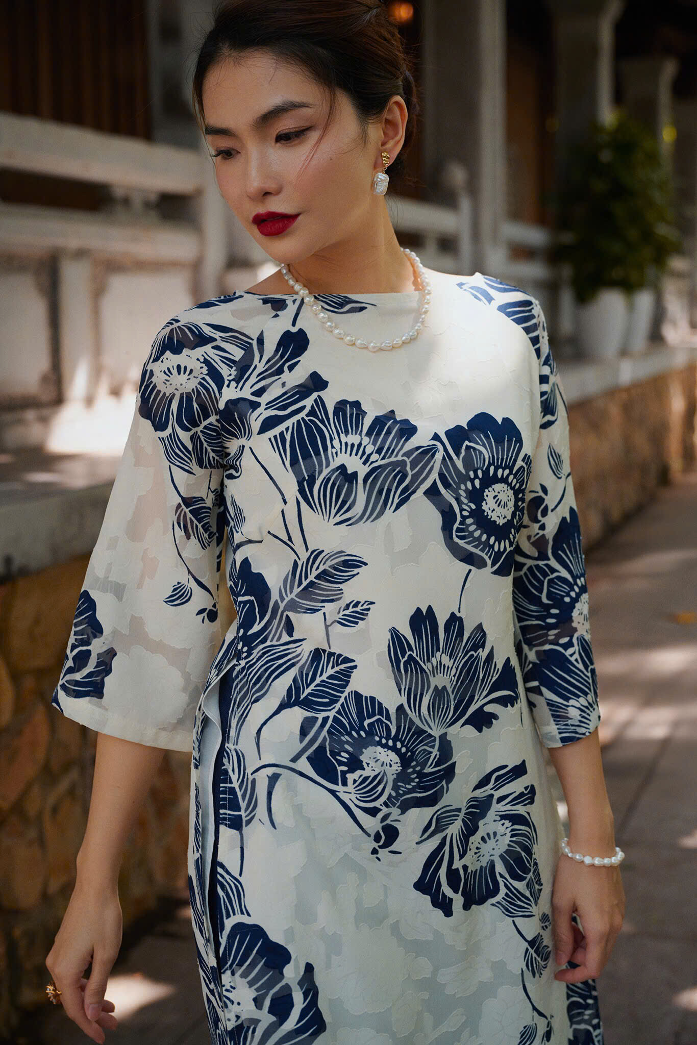 Sử dụng chất liệu Rayon xuyên thấu ép hoa, tà áo bay nhẹ trong gió, điểm nhấn là những đóa hoa lam ép tinh xảo. Cổ thuyền thanh lịch ôm nhẹ lấy bờ vai, tạo nên sự mềm mại và thanh thoát.