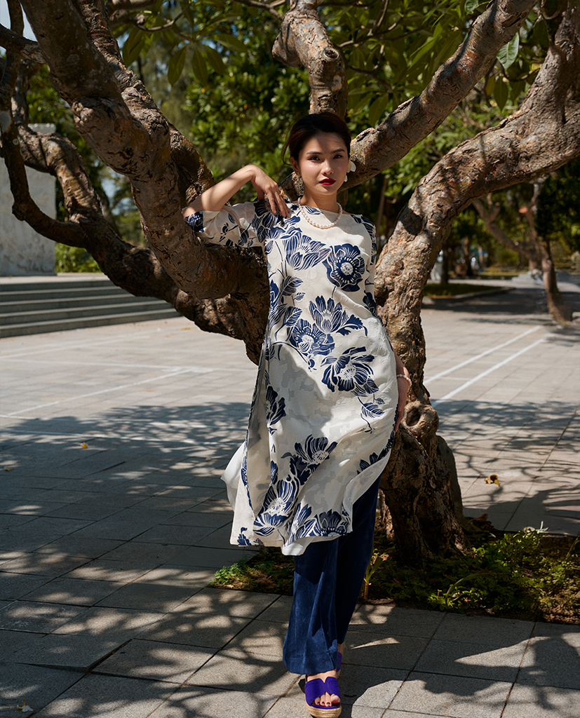 Trong không gian tĩnh tại giữa ánh nắng và tán cây uốn lượn, chiếc áo dài cổ thuyền từ Hity trở thành một dấu lặng đầy thi vị – nơi vẻ đẹp truyền thống được tái hiện với tinh thần tự do và hiện đại.