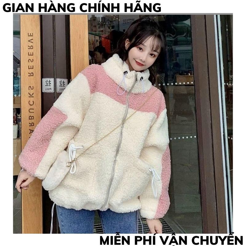 Áo khoác lông cừu phối mầu trắng hồng ,áo khoác lông mượt mà, áo khoác lông nữ, ao lông nữ áo lông siêu ấm, XƯỞNG MAYTC2