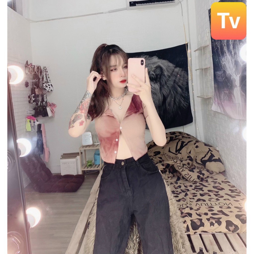 Thời Trang Nữ > Áo > Áo sơ mi || Áo kiểu croptop phối màu loang cài nút trước xinh , chất thun bozip mềm mịn ( ảnh thật )