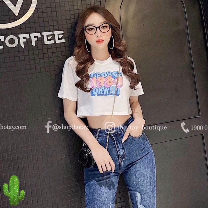 Áo kiểu croptop tay ngắn in chữ xanh hồng cực xinh , chất thun bozip mềm mịn ( ảnh thật )