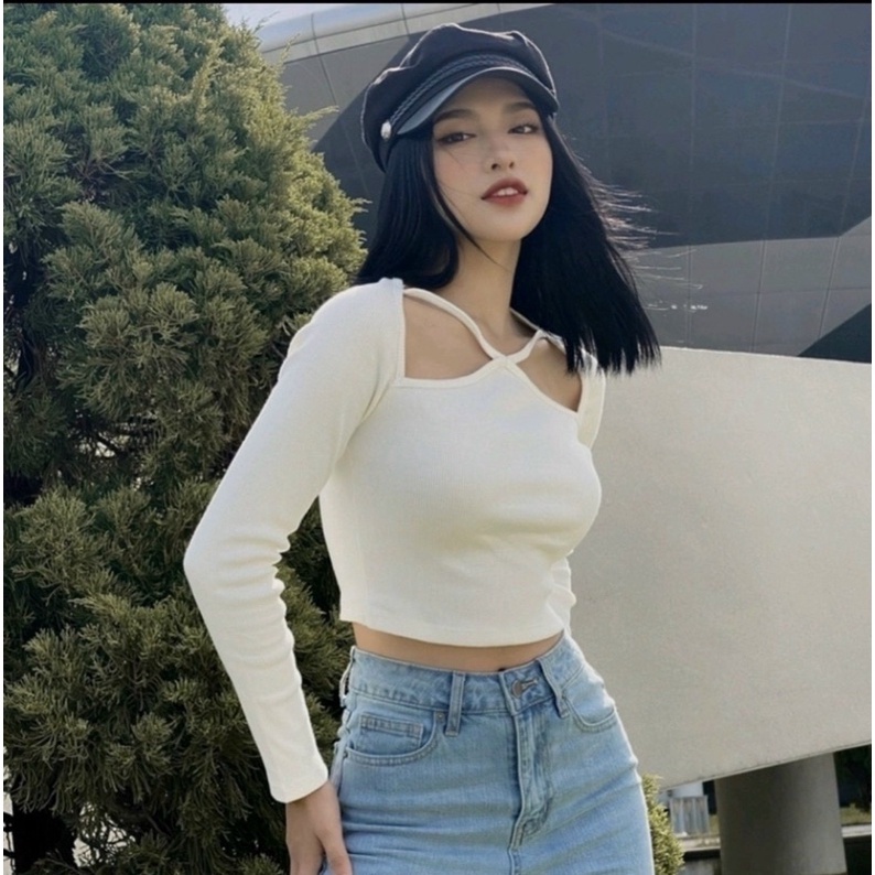 Giới thiệu Áo kiểu gân khoét vai tay dài, áo thun nữ dây chéo cổ