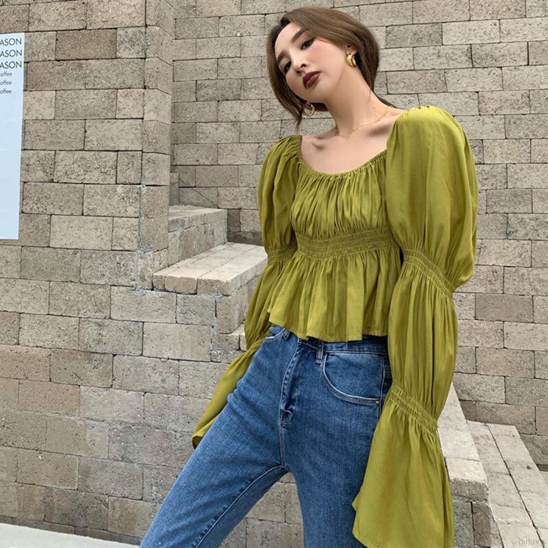 Áo kiểu nữ cổ vuông chất lụa mát màu xanh lá