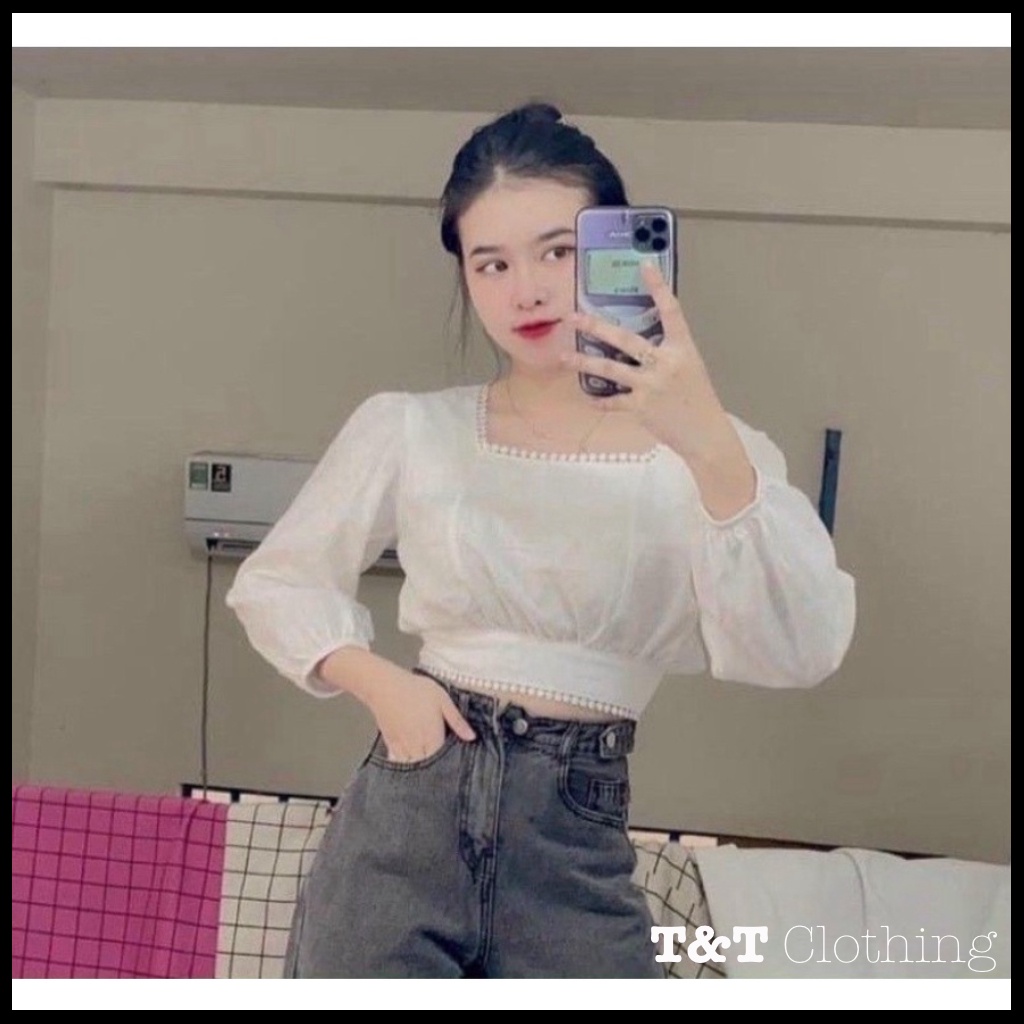 Thời Trang Nữ > Áo > Khác || Áo kiểu nữ cột nơ phối ren | Áo croptop kiểu tay dài cổ tròn viền By 23t.shop
