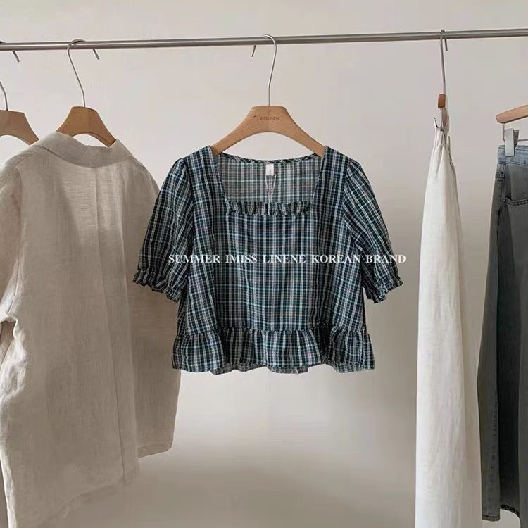 Thời Trang Nữ > Áo > Khác || Áo kiểu nữ kẻ sọc cổ vuông tay lỡ