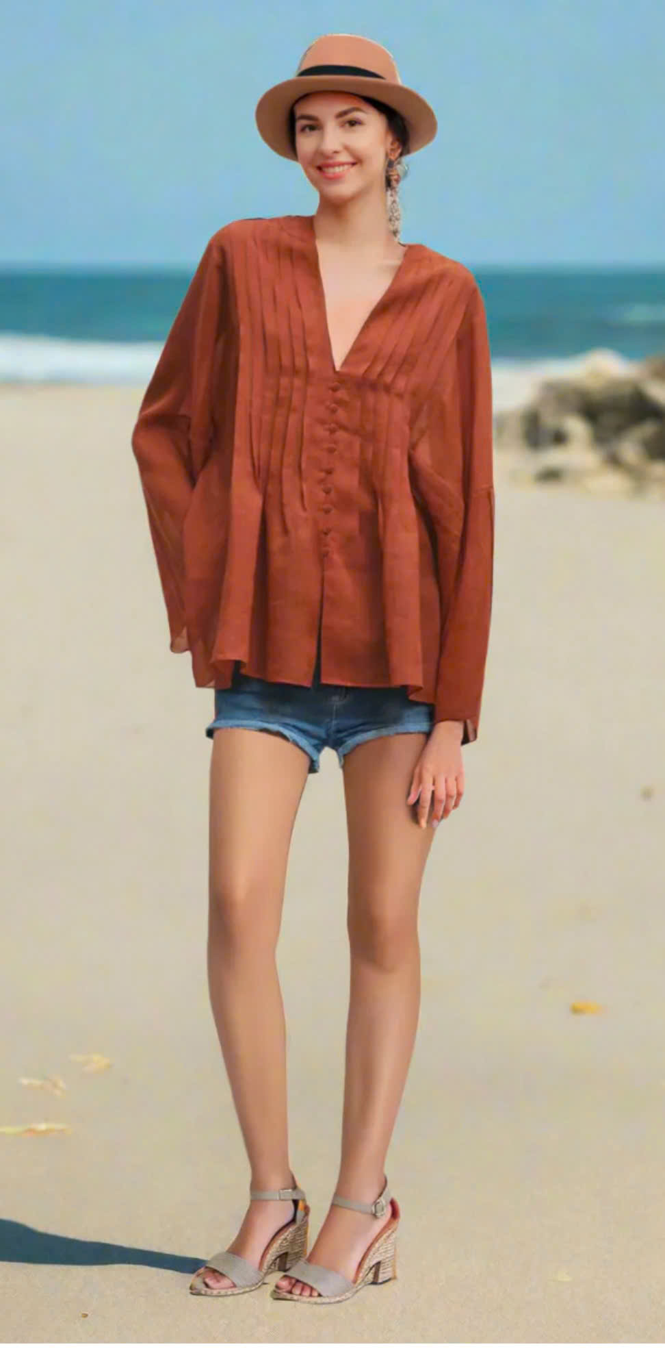 Trên nền chất liệu linen mỏng nhẹ, thoáng mát mang sắc cam đất nồng nàn của một buổi chiều thu, những đường xếp ly được xử lý thủ công một cách tỉ mỉ, chạy dọc thân áo như những phím đàn dương cầm đang chờ được tấu lên một bản nhạc du dương. Kỹ thuật xếp ly không chỉ tạo ra hiệu ứng thị giác độc đáo, kéo dài vóc dáng mà còn là minh chứng cho tay nghề chế tác bậc thầy.