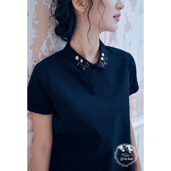 Giới thiệu Áo linen xanh tím than cổ đức thêu tay Lá In Hoa