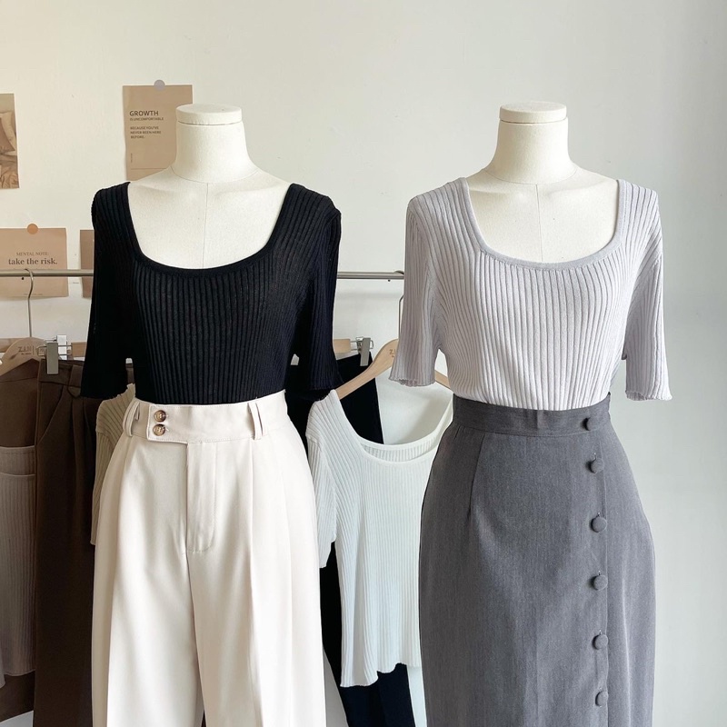 Áo montagut cổ vuông, bảng màu vintage chất mát