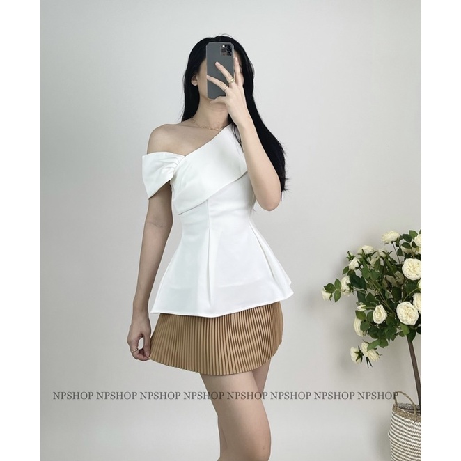 Áo nữ kiểu lệch vai ôm eo dáng xoè màu trắng, đen Nhipham shop/Rana Top