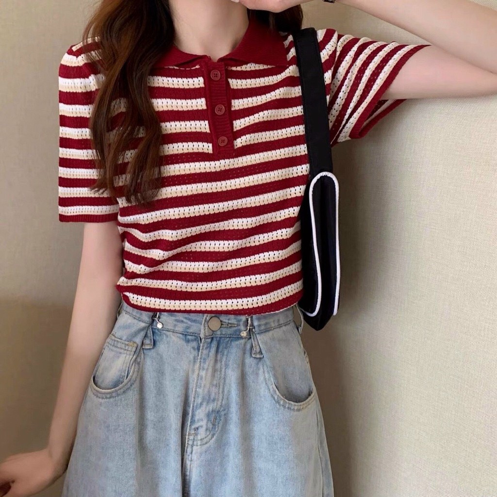 Thời Trang Nữ > Áo > Áo polo || Áo polo len kẻ ngang cúc ngực