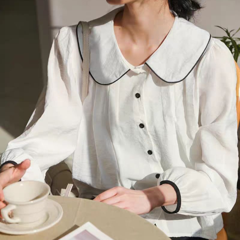 Thời Trang Nữ > Áo > Áo sơ mi || áo sơ mi cổ sen viền đen vintage ảnh thật