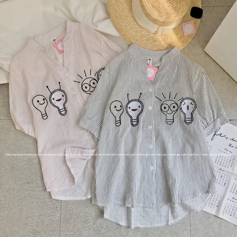 Giới thiệu Áo sơ mi cổ trụ thêu hình tay ngắn nhiều màu sọc freesize Pumi