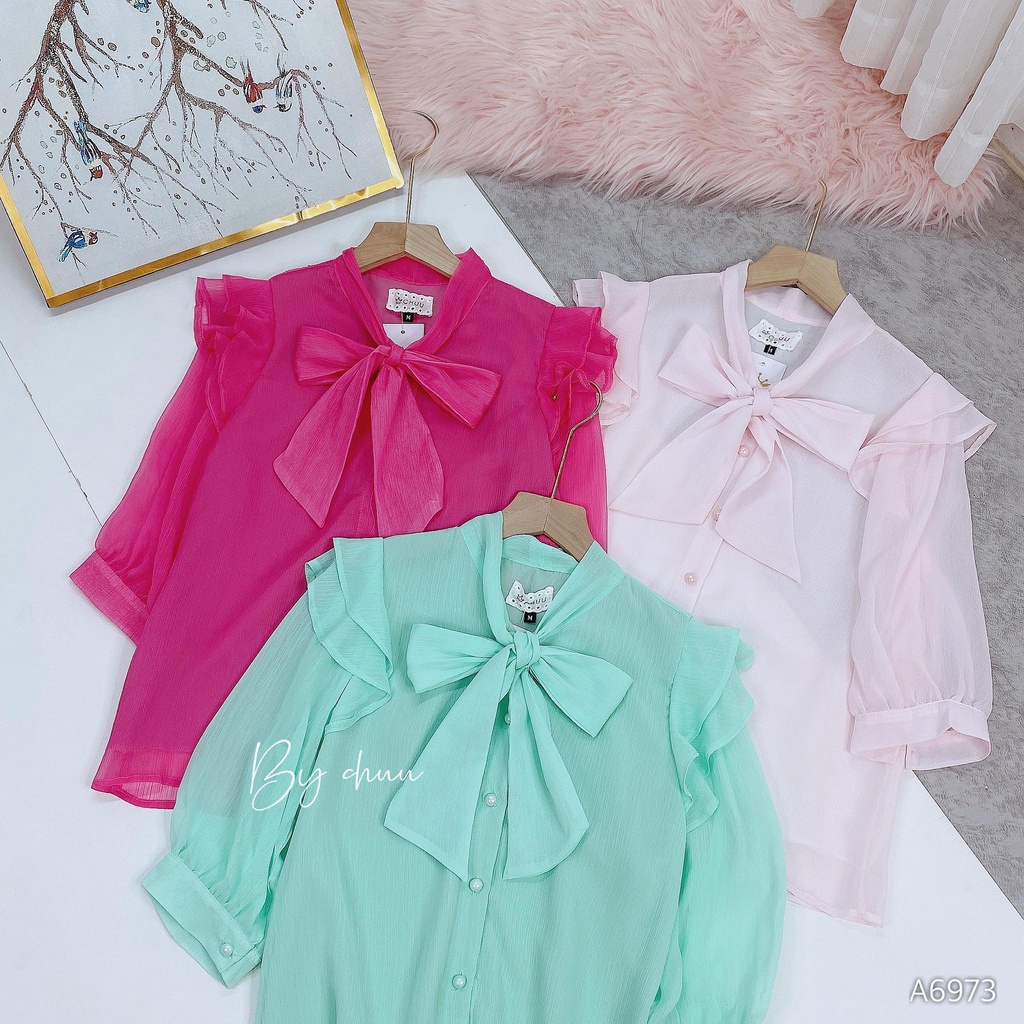 Giới thiệu Áo sơ mi công sở nữ cổ thắt nơ tay lửng cánh tiên CHUU A6973