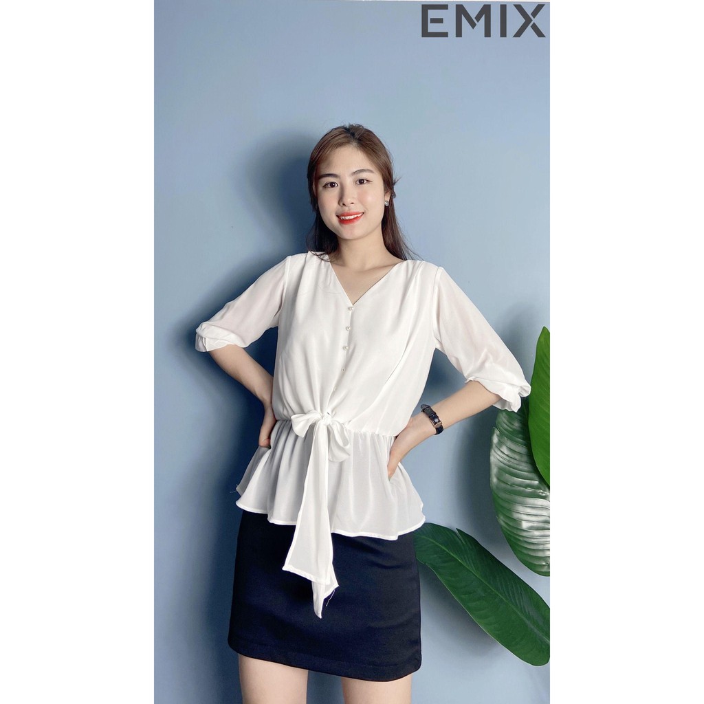 Giới thiệu Áo sơ mi công sở thắt nơ eo EMIX (màu dáng), dáng dài, tay bèo, cổ V, vải lụa dư mềm đẹp, co giãn, không nhăn