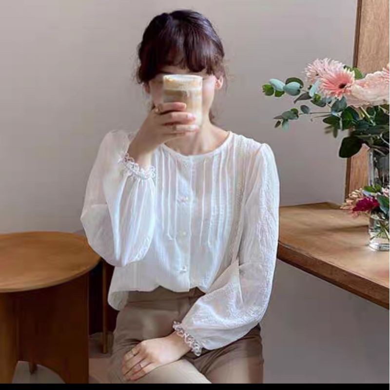 Thời Trang Nữ > Áo > Áo sơ mi || áo sơ mi kiểu cổ tròn li ngực vintage tiểu thư ảnh thật