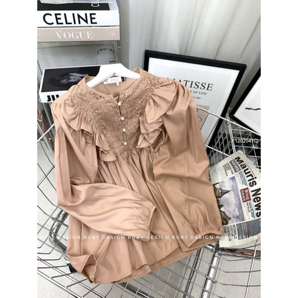 Áo sơ mi kiểu nhún ngực phối bèo tay dài bo chun