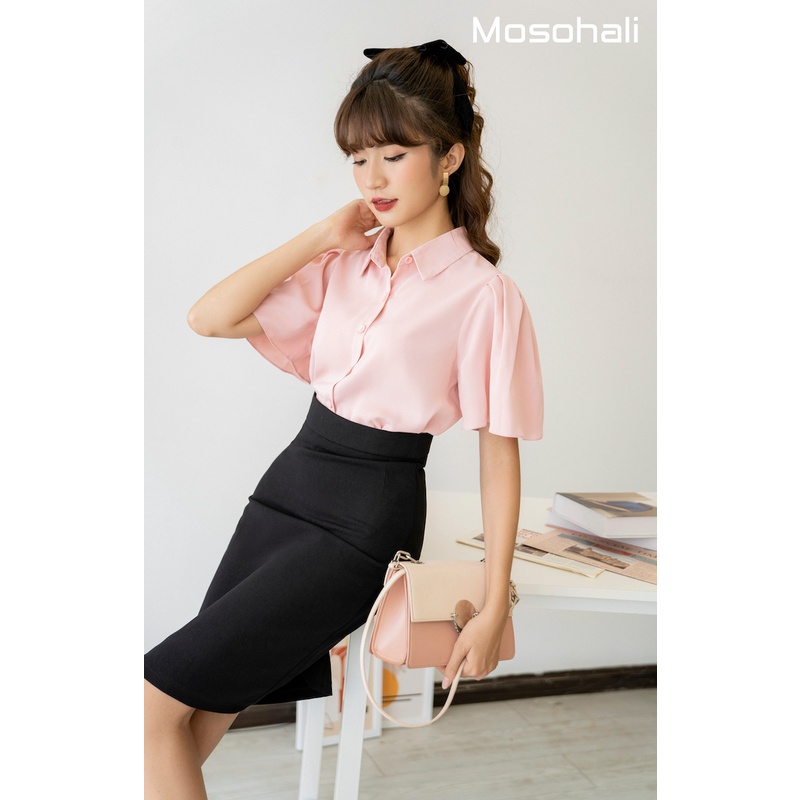 Áo sơ mi nữ tay bèo Mosohali hồng + Chân váy chữ A thiết kế mosohali