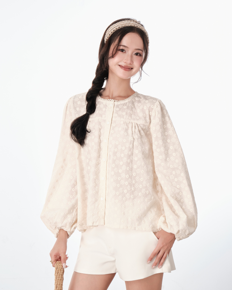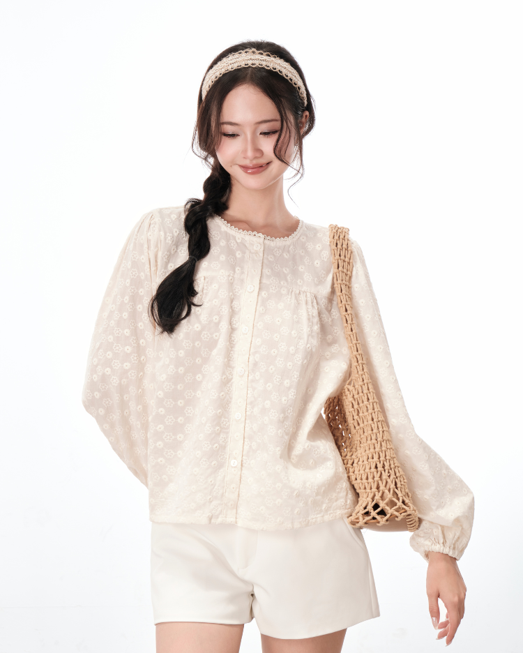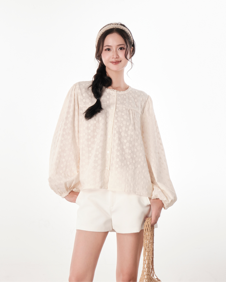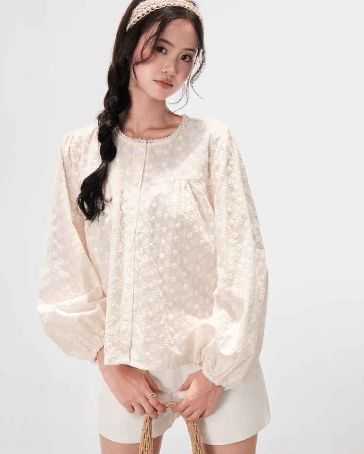 ✿ Sản phẩm : Áo sơ mi nữ thêu hoa tay dài bồng cổ tròn phong cách Liam Miều Est.2013