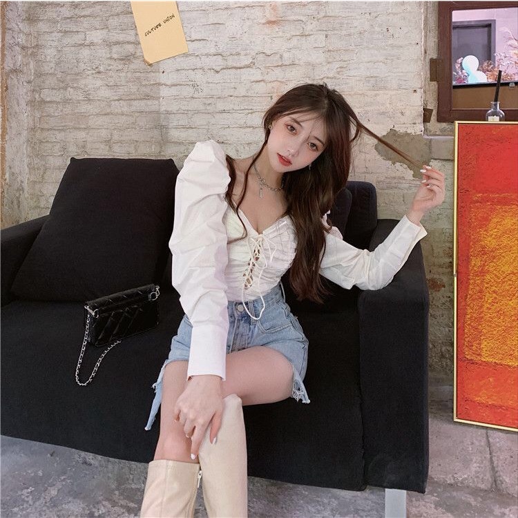 Sản phẩm: Áo so mi đan dây chéo trước ngực, làm ôm vòng ngực, form lên ôm dáng. Có thể mặc trễ vai được.