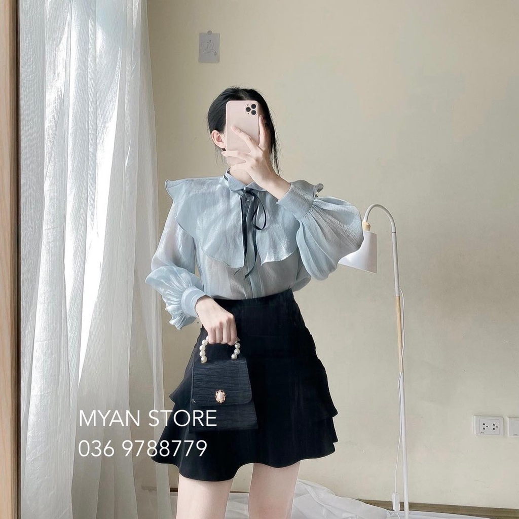 Giới thiệu Áo sơ mi viền ruy băng đen, cổ phủ vai Avn072106