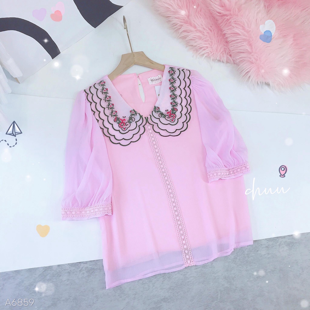 Áo sơ mi voan tơ, phối cổ thêu họa tiết hoa lá, tay phồng, phong cách tiểu thư CHUU A6859