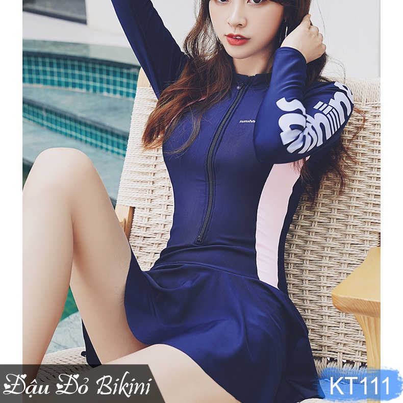 Giới thiệu Áo tắm big size nữ dáng liền thân dài tay khóa kéo, có size lớn đến 90kg, mẫu thể thao trẻ trung, che bụng tốt | KT111