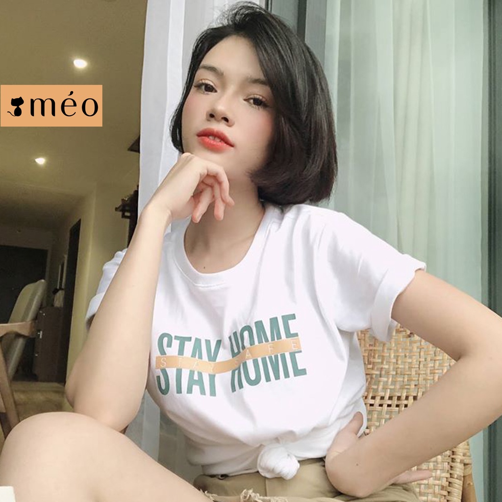 Giới thiệu Áo thun tay lỡ Méo shop phông nữ cổ tròn cotton in chữ Stay home freesize form rộng