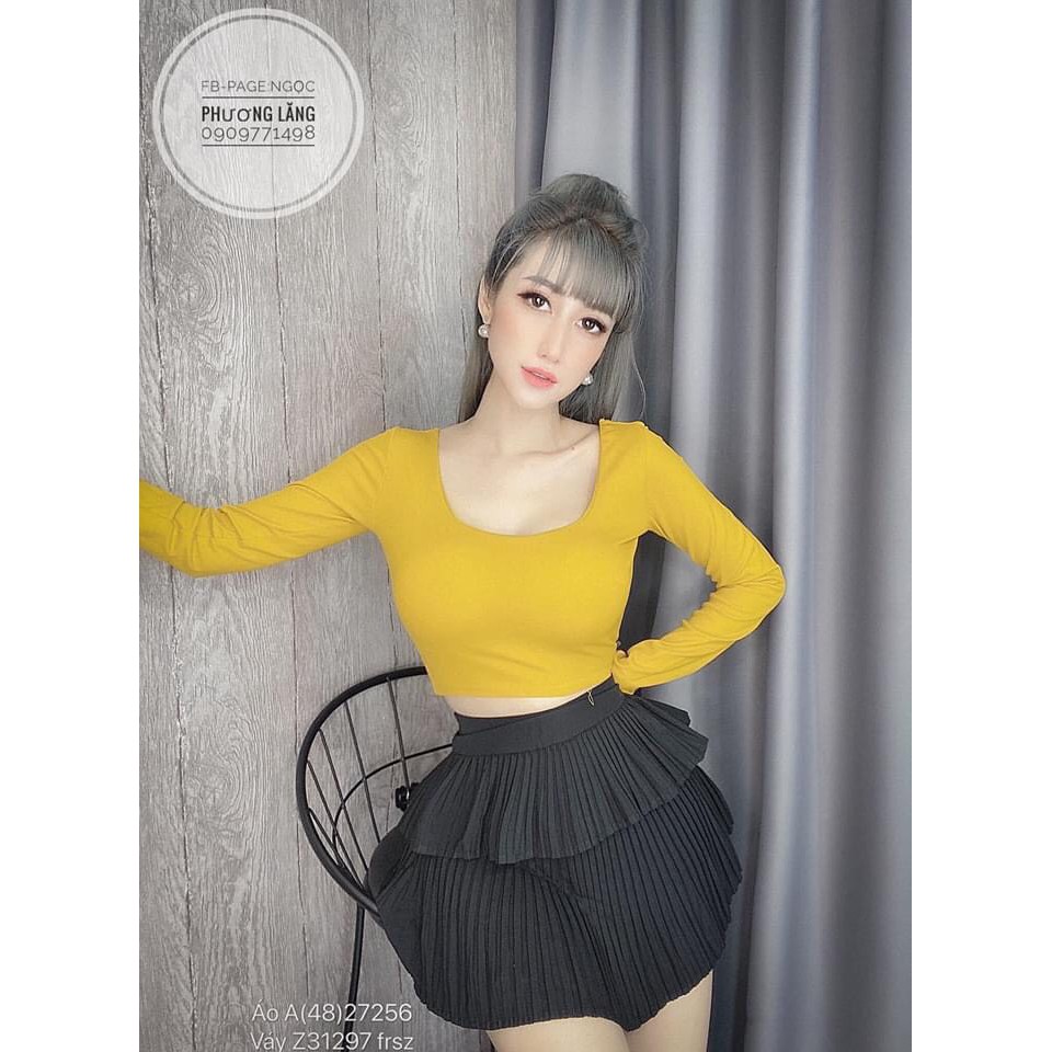 Thời Trang Nữ > Áo > Áo sơ mi || Áo thun lụa croptop tay dài cổ vuông dáng croptop xinh tôn dáng cực xinh mát