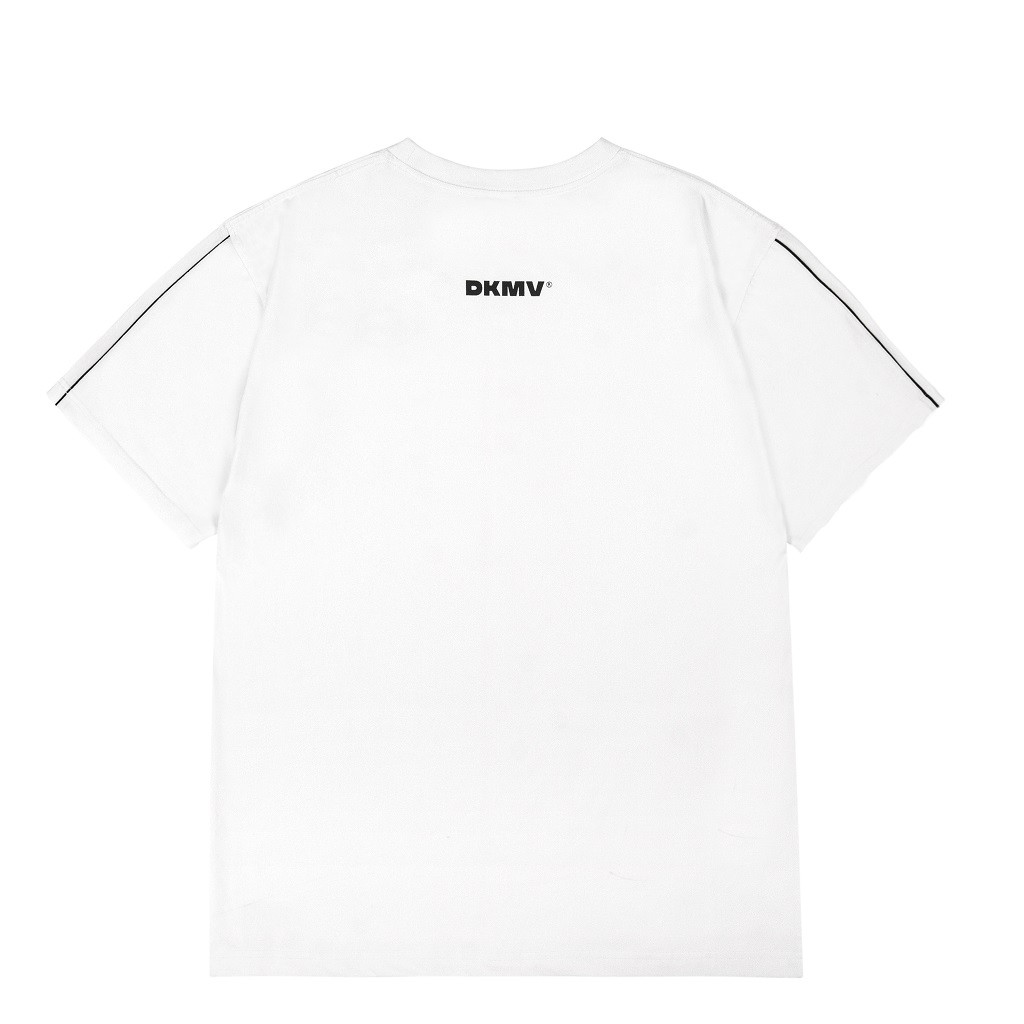 - Chi tiết tag Logo DKMV đặc trưng ở áo thun nữ form rộng màu trắng dòng kẻ.
