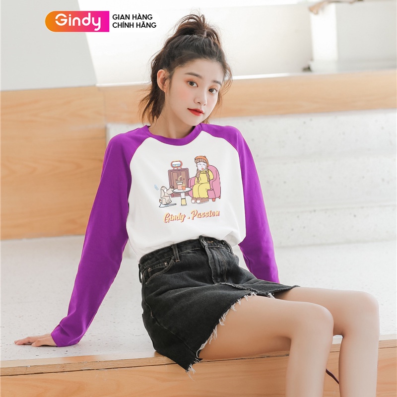 Áo thun phông dài tay nữ cổ tròn GINDY form rộng in hình vải cotton 100% co dãn 4 chiều thời trang nữ thu đông A10104