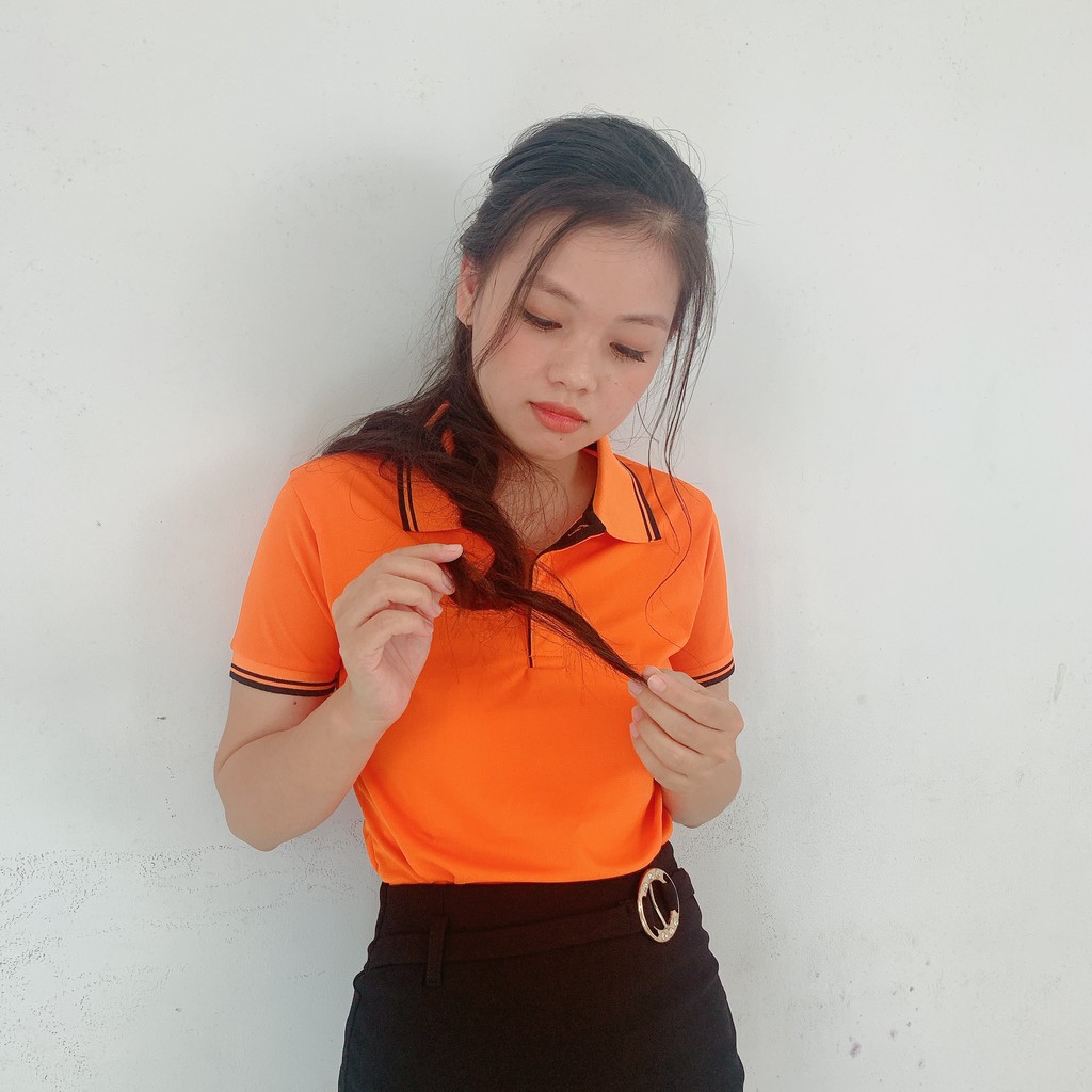Giới thiệu Áo Thun POLO đồng phục Nam/Nữ Cổ Bẻ Màu Cam Vải Thun Thái Co Giãn