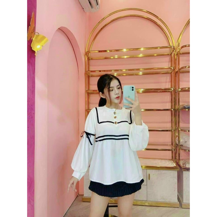 Giới thiệu Áo Voan Hàn Quốc Cổ Tròn Tay Dài Phối Nút Gài Kèm Sọc Ngang Siêu Xinh TTSLA0711