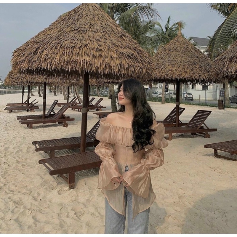 Thời Trang Nữ > Áo > Khác || Áo xẻ tà trước tay dài chất voan tơ nude