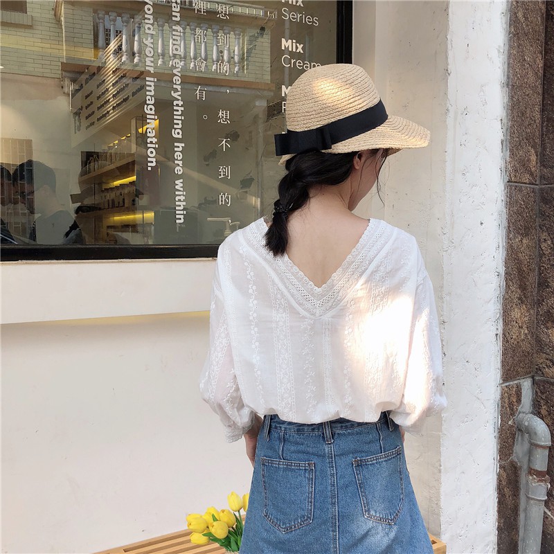 Thời Trang Nữ > Áo > Áo sơ mi || Áo xô ren trắng trơn cổ V tay lỡ