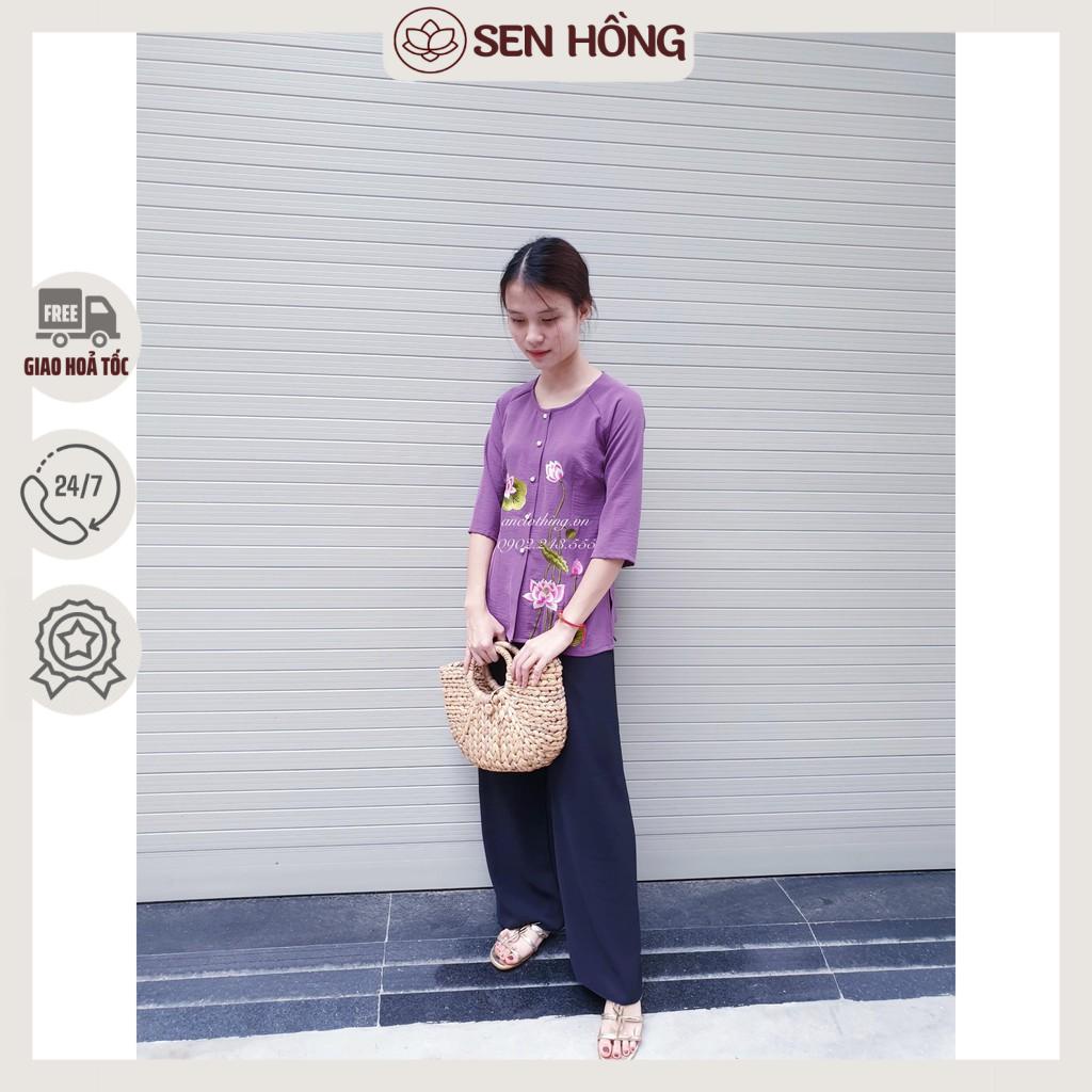Giới thiệu Bộ bà ba đi lễ dành cho phật tử nữ - đồ áo bà ba đẹp vải đũi thêu sen – Tím